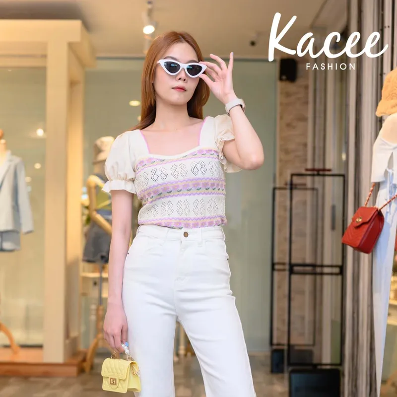 รายละเอียดของสินค้า: เสื้อแขนตุ๊กตา คอเหลี่ยม งานฉลุ แต่งลายดอกไม้ ทรงครอป