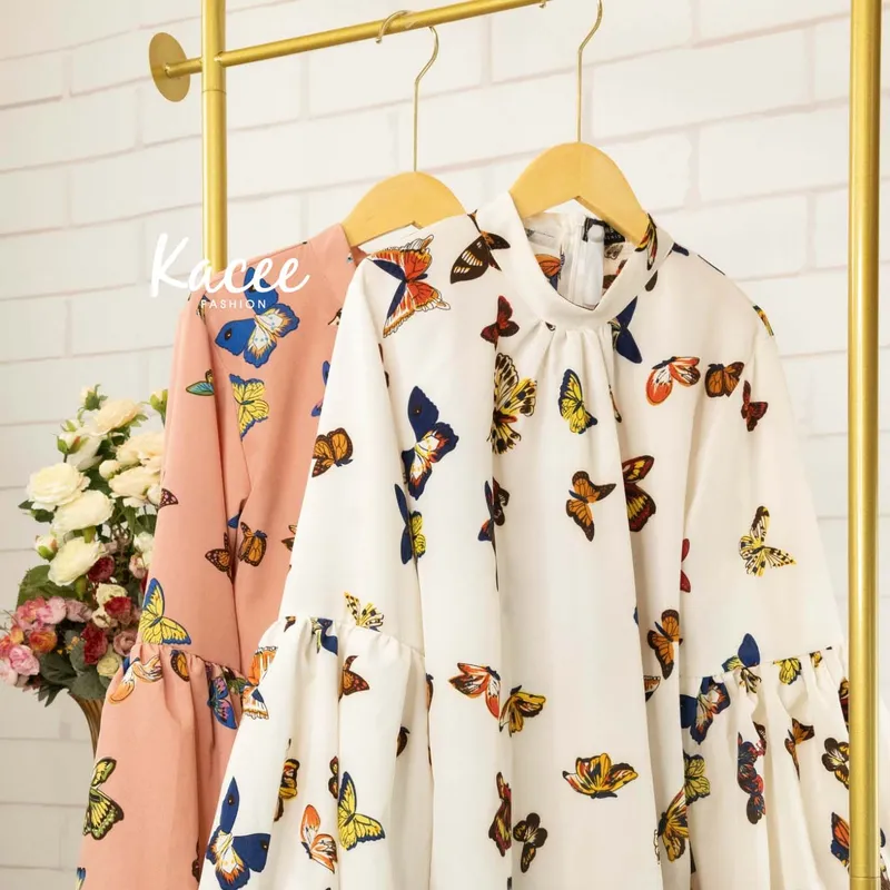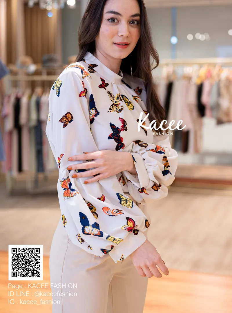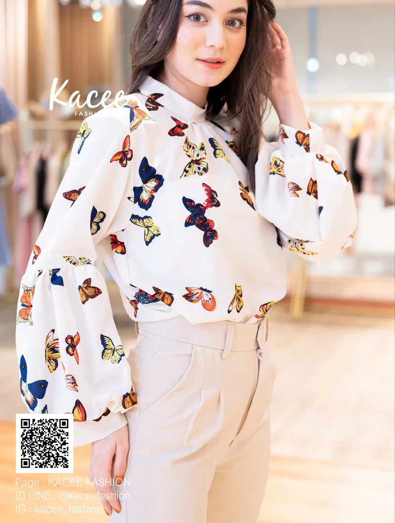 รายละเอียดสินค้า: เสื้อแขนยาวพอง พิมลายผีเสื้อ คอเต่า ซิบรูดด้านหลัง