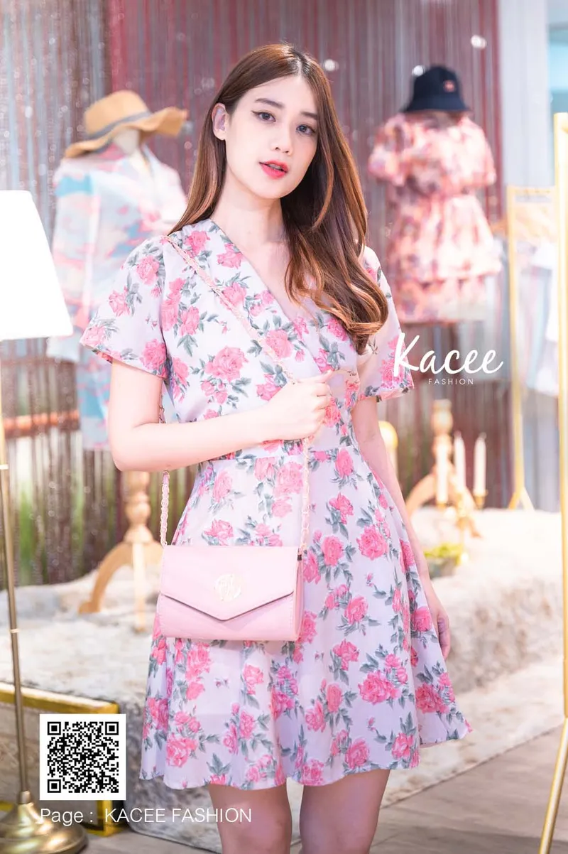 รายละเอียดสินค้า: ชุดเดรสลายดอกไม้ แขนสั้น คอวี มีเชือกผูกหลัง ซิบรูดด้านหลัง ชายเรียบ