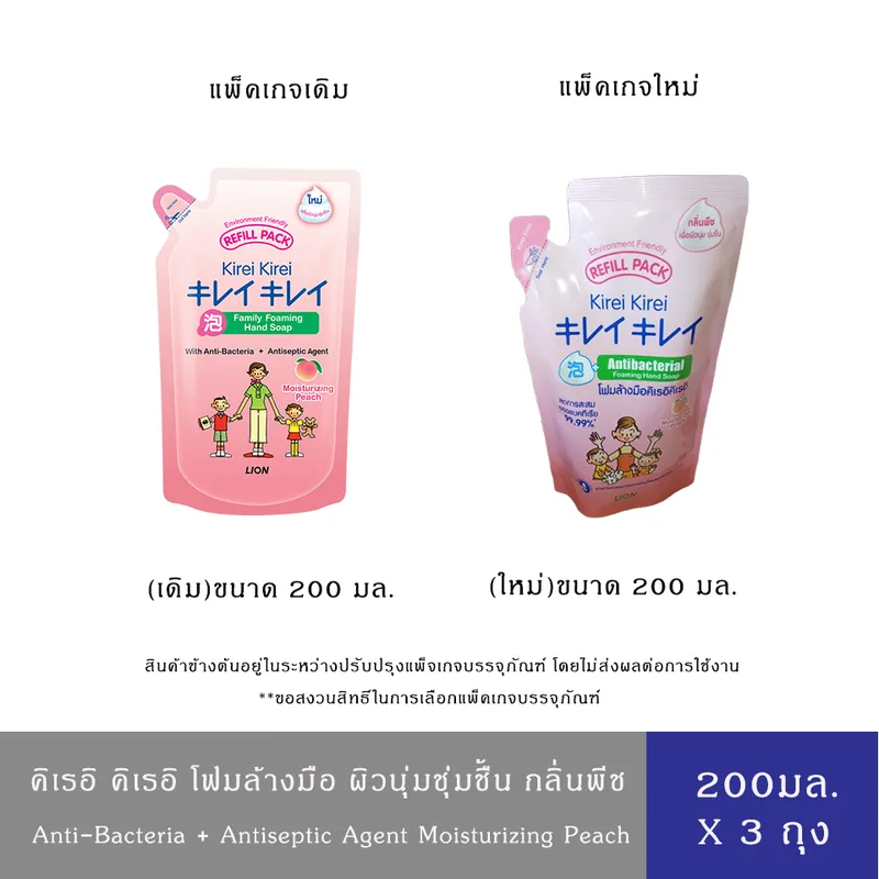 Kirei Kirei โฟมล้างมือ คิเรอิ คิเรอิ กลิ่น พีช Moisturizing Peach ชมพู ชนิดถุงเติม 200 ml 3 ถุง โฟมล้างมือ คิเรอิคิเรอิ กลิ่น Moisturizing Peachขายดีเป็นอันดับ 1* ทั้งในไทยและญี่ปุ่น ด้วยเนื้อฟองโฟมนุ่ม ละเอียด สามารถซอกซอนทำความสะอาดได้อย่างมีประสิทธิภาพ มีส่วนผสมของ Anti - Bacteria และ Antiseptic สูตรปกป้องมือจากแบคทีเรีย คงความชุ่มชื่นด้วย Moisturizing Peach อ่อนโยนต่อผิวด้วย 99 % ของสารทำความสะอาดมาจากพืชธรรมชาติ*Japan’s No.1 Hand Soap Series - Intage SRI Hand Soap Value Sales Jan. 2000 - Dec 2012, consecutive years