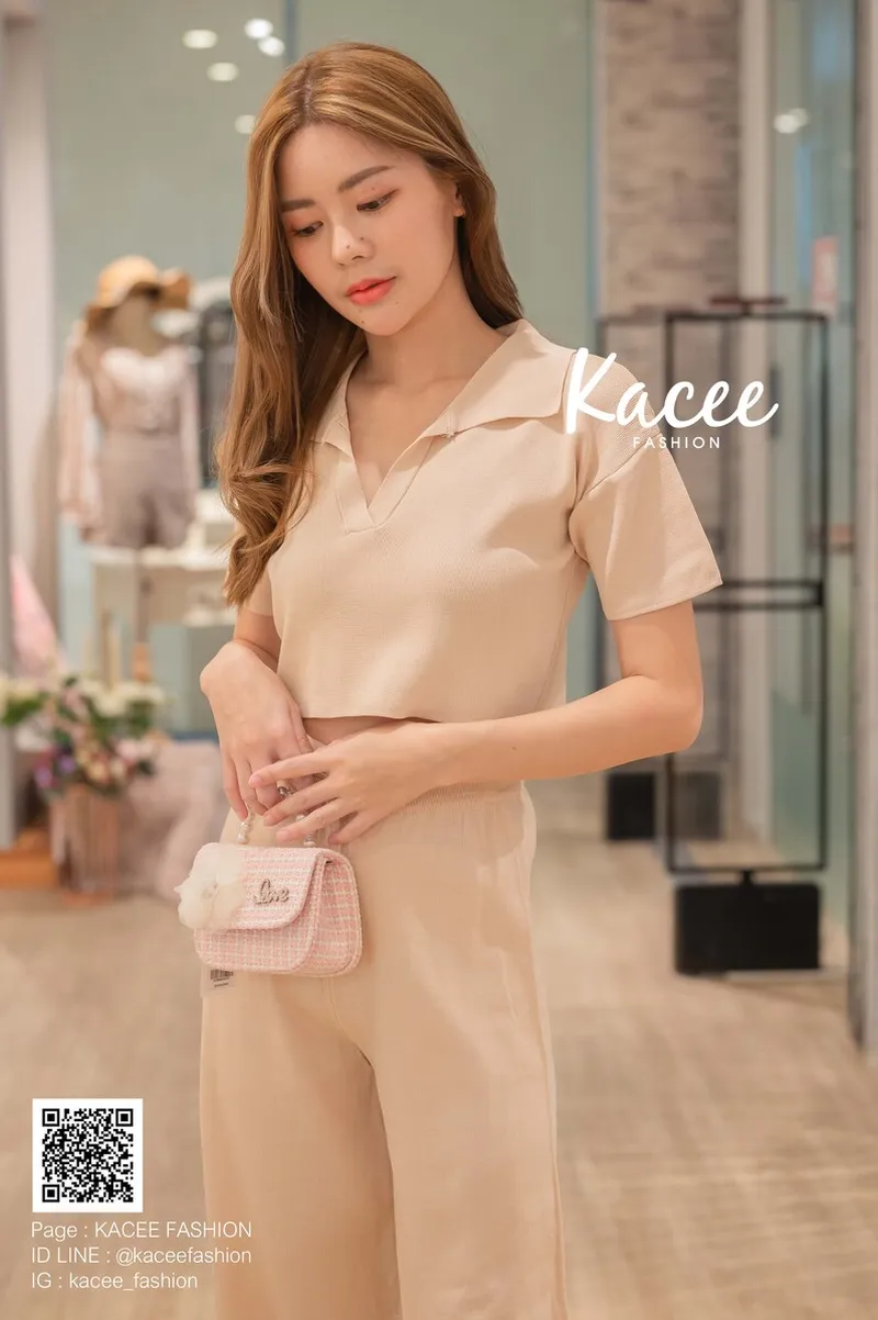 ชุดเซต เสื้อแขนสั้น ทรงครอป คอปก ผ้าไหมพรม