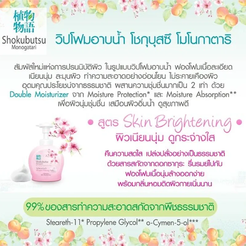 • วิปโฟมอาบน้ำ โชกุบุสซี โมโนกาตาริ สัมผัสใหม่แห่งการปรนนิบัติผิว ในรูปแบบวิปโฟมอาบน้ำ ฟองโฟมเนื้อละเอียดเนียนนุ่ม ละมุนผิว