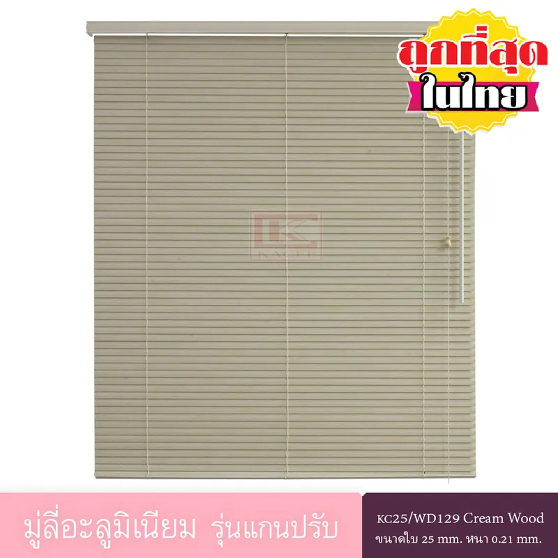 * ใน 1 ชุดจะประกอบด้วย : มู่ลี่อะลูมิเนียมขนาดใบกว้าง 25 มม. หนา 0.21 มม. รหัส KC25/WD129 สี Cream Wood
