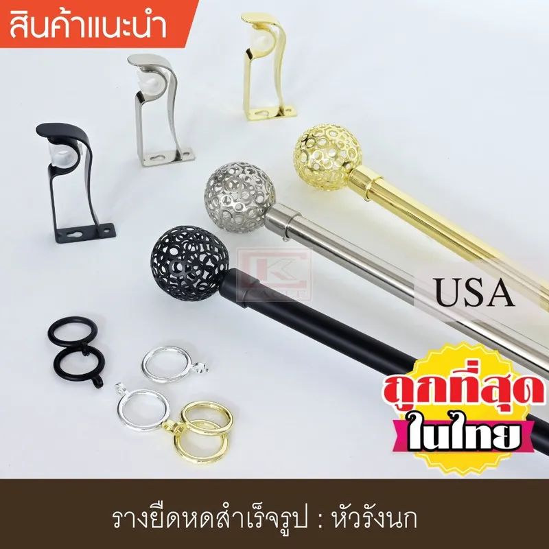 ขนาดปรับได้ 0.70 - 1.20 เมตร (ขนาดไม่รวมส่วนหัวราง) = รับน้ำหนักผ้าม่านได้ 8 กก.ใน 1 ชุดประกอบด้วย : ราวผ้าม่าน 2 ชิ้น (ขนาด 19 มม. และ 16 มม. เอามาประกอบกันเป็น 1 เส้น) จับกลาง 1 ชั้น 2 อัน, ห่วง 12 อัน2. ขนาดปรับได้ 0.85 - 1.50 เมตร (ขนาดไม่รวมส่วนหัวราง) = รับน้ำหนักผ้าม่านได้ 7 กก.ใน 1 ชุดประกอบด้วย : ราวผ้าม่าน 2 ชิ้น (ขนาด 19 มม. และ 16 มม. เอามาประกอบกันเป็น 1 เส้น) จับกลาง 1 ชั้น 2 อัน, ห่วง 15 อัน3. ขนาดปรับได้ 1.10 - 2.00 เมตร (ขนาดไม่รวมส่วนหัวราง) = รับน้ำหนักผ้าม่านได้ 6 กก.ใน 1 ชุดประกอบด้วย : ราวผ้าม่าน 2 ชิ้น (ขนาด 19 มม. และ 16 มม. เอามาประกอบกันเป็น 1 เส้น) จับกลาง 1 ชั้น 2 อัน, ห่วง 20 อัน4. ขนาดปรับได้ 1.30 - 2.50 เมตร (ขนาดไม่รวมส่วนหัวราง) = รับน้ำหนักผ้าม่านได้ 8 กก.ใน 1 ชุดประกอบด้วย : ราวผ้าม่าน 2 ชิ้น (ขนาด 19 มม. และ 16 มม. เอามาประกอบกันเป็น 1 เส้น) จับกลาง 1 ชั้น 3 อัน, ห่วง 25 อัน### วิธีการติดตั้ง