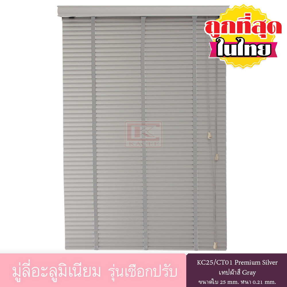 * ใน 1 ชุดจะประกอบด้วย : มู่ลี่อะลูมิเนียมขนาดใบกว้าง 25 มม. หนา 0.21 มม. รหัส KC25/CT01 สี Premium Silver เทปผ้าสี Gray