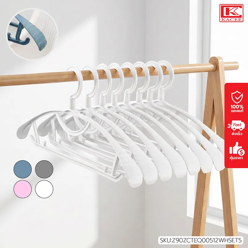 ไม้แขวนเสื้อพลาสติก แพ็ค 5 อัน เสริมบ่า กันลื่น เสื้อไม่เสียทรง น้ำหนักเบา หมุน 360 องศา