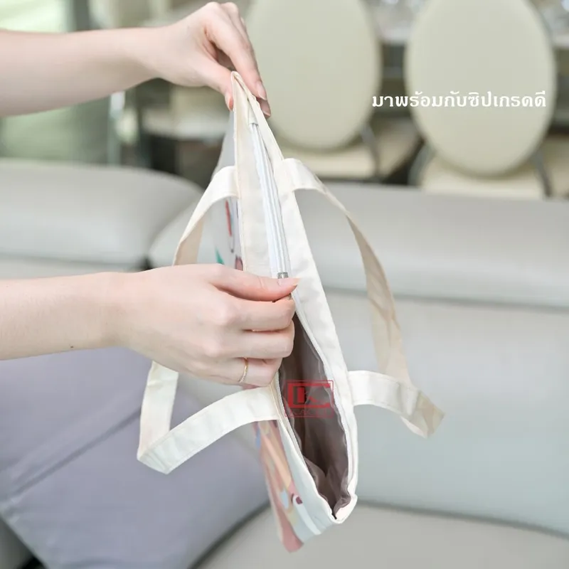 ● กระเป๋าผ้ากันน้ำ ขนาด 34.8x38x1 ซม. มี 3 แบบกระเป๋าเคลือบ PVC กันน้ำ ผ้าไมโครพีชกันน้ำ พิมพ์ลาย ผ้าลื่น ใบใหญ่ รับน้ำหนักได้ดี งานเย็บดี ซิปลื่น สามารถเช็ดทำความสะอาดได้ง่าย กระเป๋า กระเป๋าผ้า กระเป๋าถือ ถุงผ้า