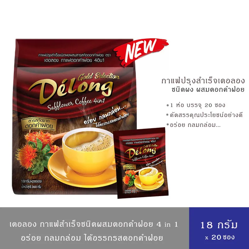 รายละเอียดสินค้า”เดอลอง กาแฟดอกคำฝอย 4IN1 ลดไขมันในเลือด บำรุงหัวใจ