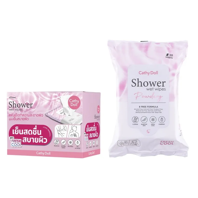 Cathy Doll เคที่ดอลล์ ชาวเวอร์เว็ท ไวพส์ พาวเดอรี่ 20 แผ่น แผ่นเช็ดทำความสะอาดผิวกายสูตรเย็น เช็ดชูเปียก กระดาษเปียก ผ้าเปียก