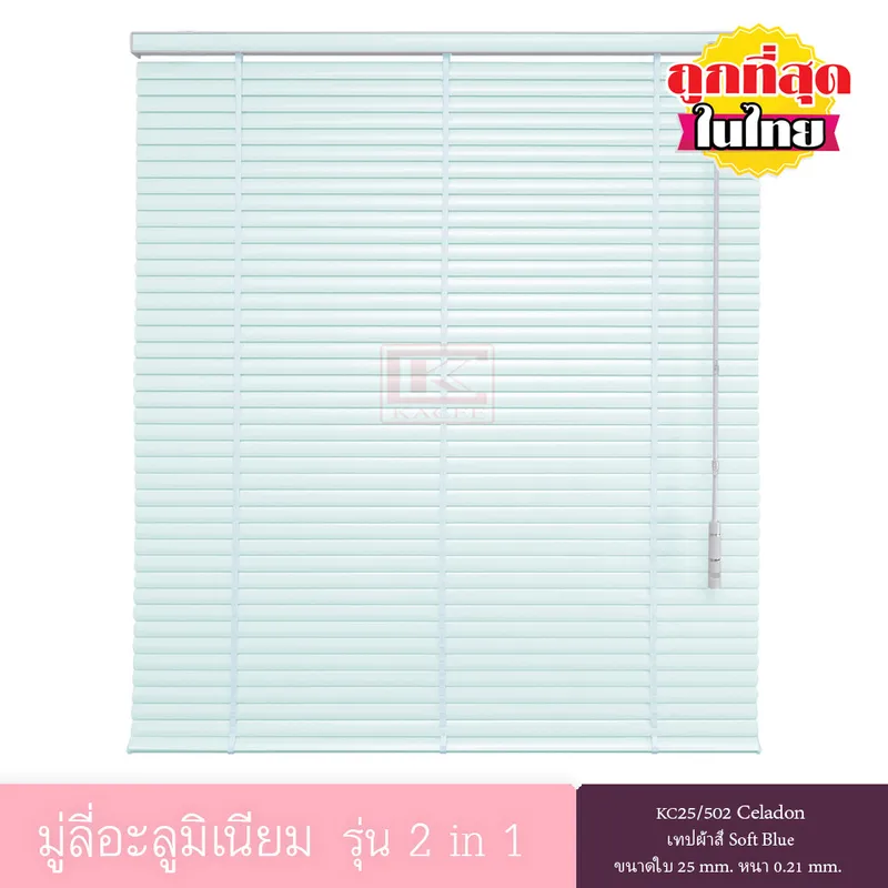 * ใน 1 ชุดจะประกอบด้วย : มู่ลี่อะลูมิเนียมขนาดใบกว้าง 25 มม. หนา 0.21 มม. รหัส KC25/502 สี Celadon เทปผ้าสี Soft Blue