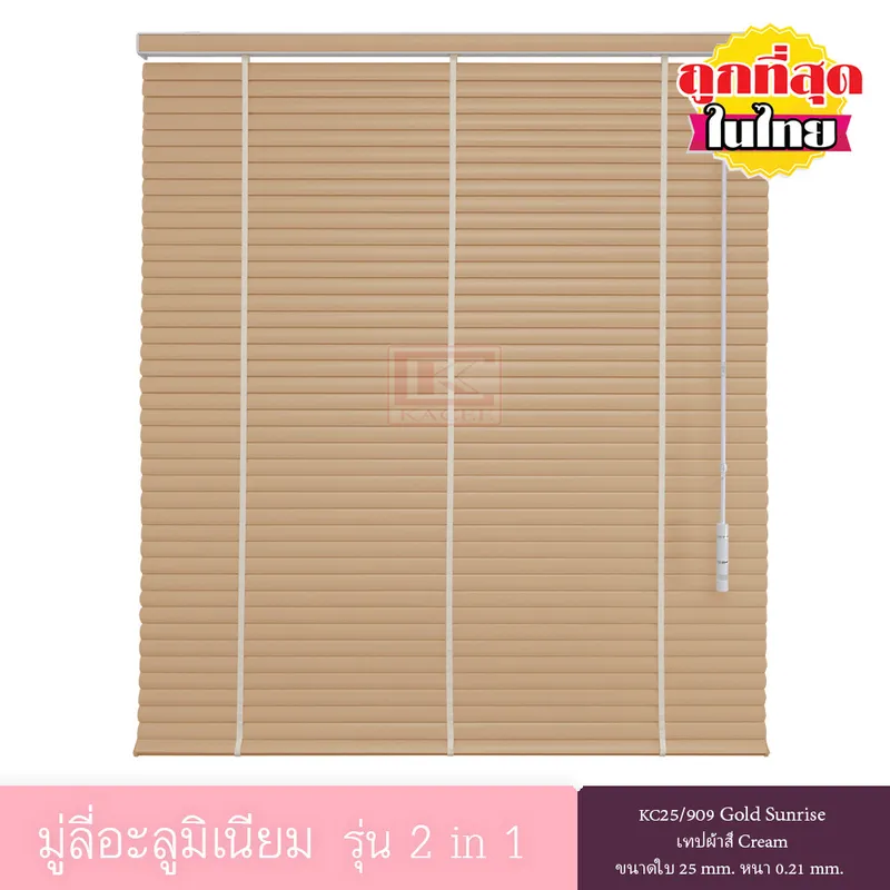 * ใน 1 ชุดจะประกอบด้วย : มู่ลี่อะลูมิเนียมขนาดใบกว้าง 25 มม. หนา 0.21 มม. รหัส KC25/909 สี Gold Sunrise เทปผ้าสี Cream
