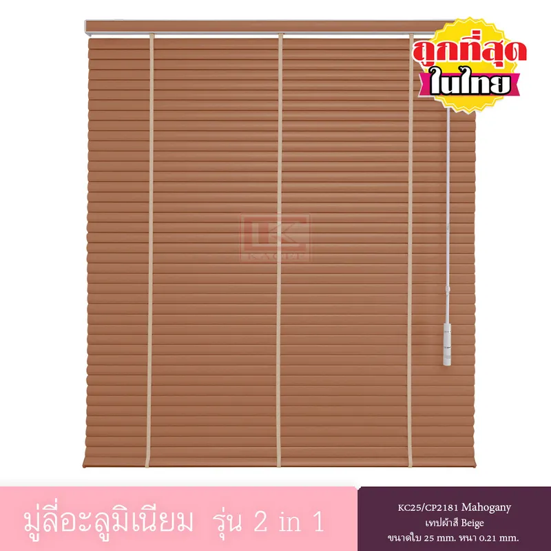 * ใน 1 ชุดจะประกอบด้วย : มู่ลี่อะลูมิเนียมขนาดใบกว้าง 25 มม. หนา 0.21 มม. รหัส KC25/CP2181 สี Mahogany เทปผ้าสี Beige