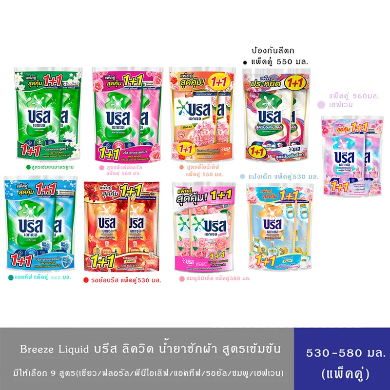 (มี 9 สูตร)Breeze Excel Liquid บรีส เอกเซล ผลิตภัณฑ์น้ำยาซักผ้า สูตรเข้มข้น ขนาด 530-580มล. (แพ็คคู่1+1)1)