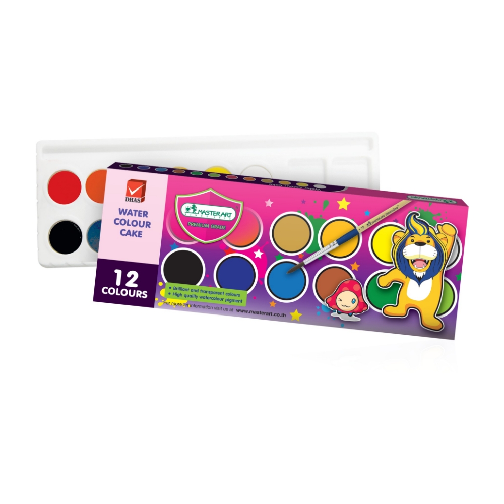 Master Art มาสเตอร์อาร์ต สีน้ำก้อน 12 สี มีถาดผสมสีภายในกล่อง โปร่งแสง 100% เนื้อสีเนียนละเอียด แน่น สามารถใช้งานได้จนหมดก้อน