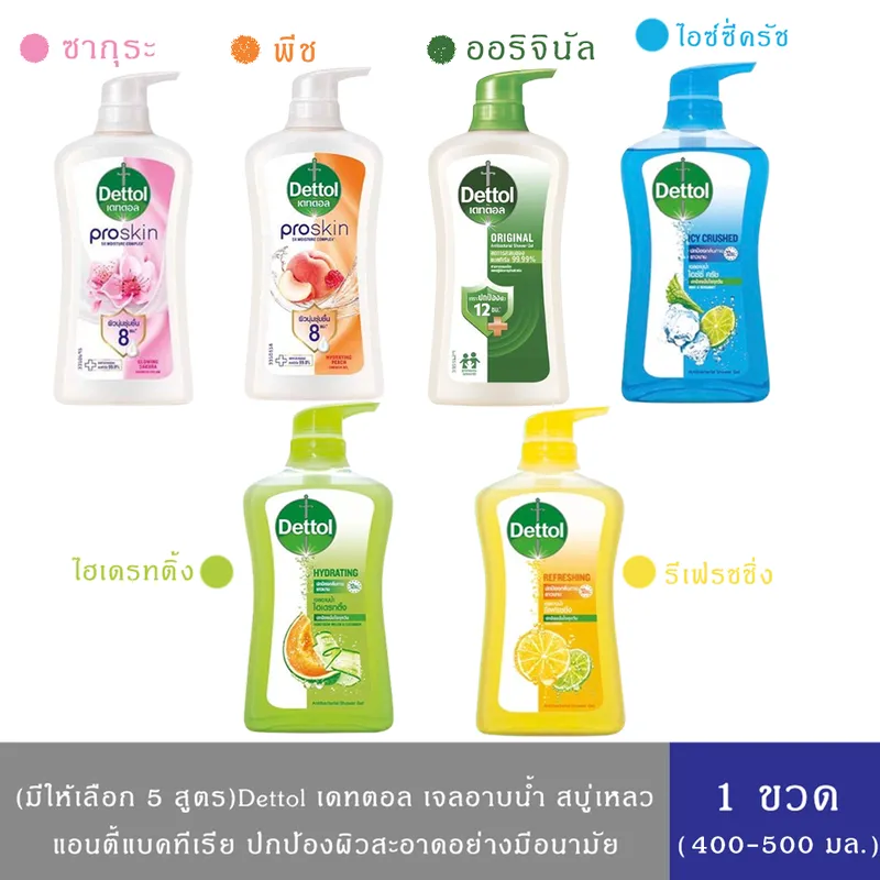 ผ่านการทดสอบโดยแพทย์ผู้เชี่ยวชาญด้านผิวหนัง 3.สบู่เหลวอาบน้ำเดทตอล แอนตี้แบคทีเรีย สูตรรีเฟรชชิ่ง พร้อมกลิ่นซีตรัสหอมสดชื่น ช่วยปกป้องกลิ่นกายยาวนาน 12 ชม.ช่วยชำระล้างและลดการสะสมของแบคทีเรียได้มากถึง 99.9%มีค่า pH-Balanced ที่ผ่านการทดสอบแล้วว่าอ่อนโยนต่อผิว ช่วยคงความชุ่มชื้นให้กับผิว เมื่อใช้เป็นประจำ เพื่อผิวสะอาดอย่างมีอนามัย รู้สึกสดชื่นในทุกวัน 4.เดทตอล สบู่เหลวอาบน้ำ แอนตี้แบคทีเรีย สูตร ไอซ์ซี่ ครัช สูตรเฉพาะที่ผสานการปกป้องจากเดทตอล ph-Balanced ที่ผ่านการทดสอบแล้วว่าอ่อนโยนต่อผิว พร้อมส่วนผสมของเมนทอล ช่วยชำระล้างและลดการสะสมของแบคทีเรีย 99.9% เพื่อปกป้องผิวให้สะอาดอย่างมีอนามัย ช่วยคืนความชุ่มชื่นให้ผิว สะอาดดูแลสุขภาพดี และเย็นสดชื่น มีชีวิตชีวาทุกวัน ช่วยปกป้องกลิ่นกาย 12 ชม.” 5.เดทตอล เจลอาบน้ำ สบู่เหลวเดทตอล แอนตี้แบคทีเรีย สูตรไฮเดรทติ้ง ชำระล้างและลดการสะสมของแบคทีเรีย 99.9%ผสานการปกป้องมั่นใจจากเดทตอล ใช้เป็นประจำ เพื่อผิวสะอาดอย่างมีอนามัย รู้สึกสดชื่นทุกวันใช้สารธรรมชาติมากกว่า 85%