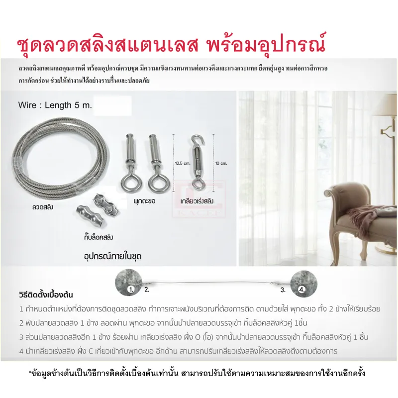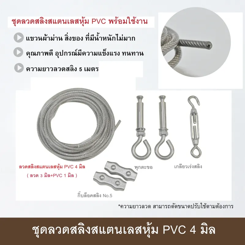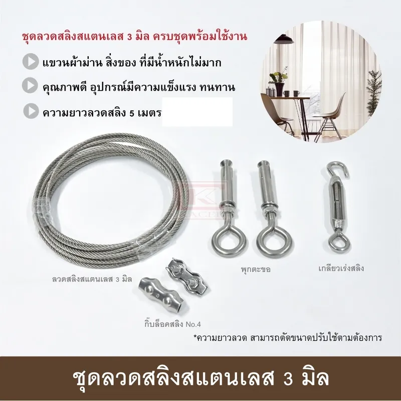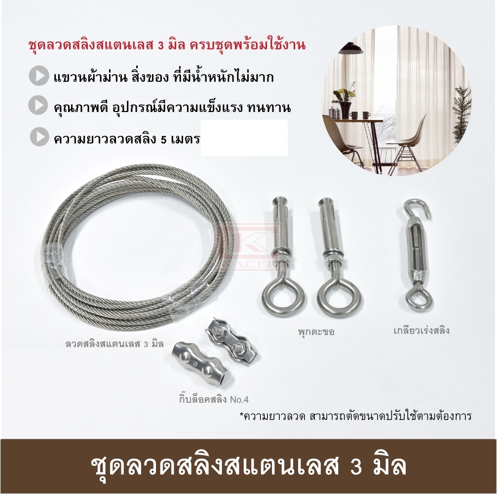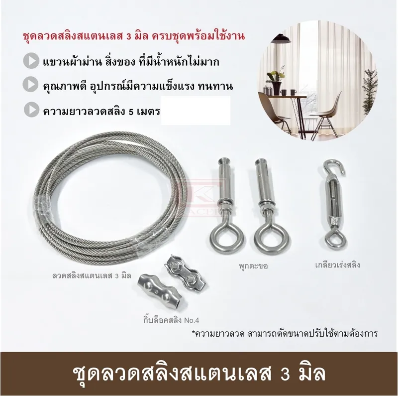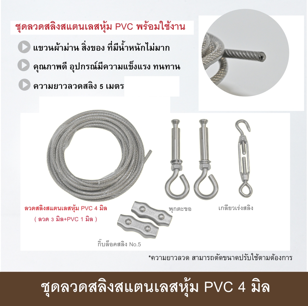 ● ชุดลวดสลิงสแตนเลส อุปกรณ์ครบชุดพร้อมใช้งาน มี 2 แบบให้เลือกใช้คือ ชุดลวดสลิงสแตนเลส 3 มิล และ ชุดลวดสลิงสแตนเลสหุ้ม PVC 4 มิล