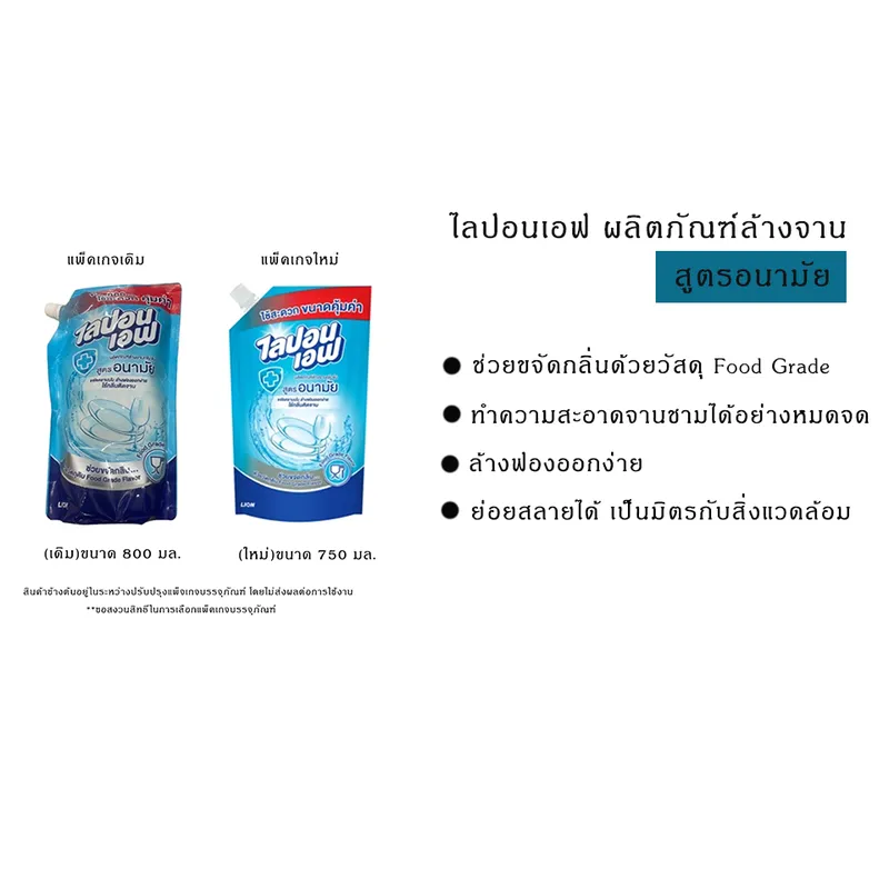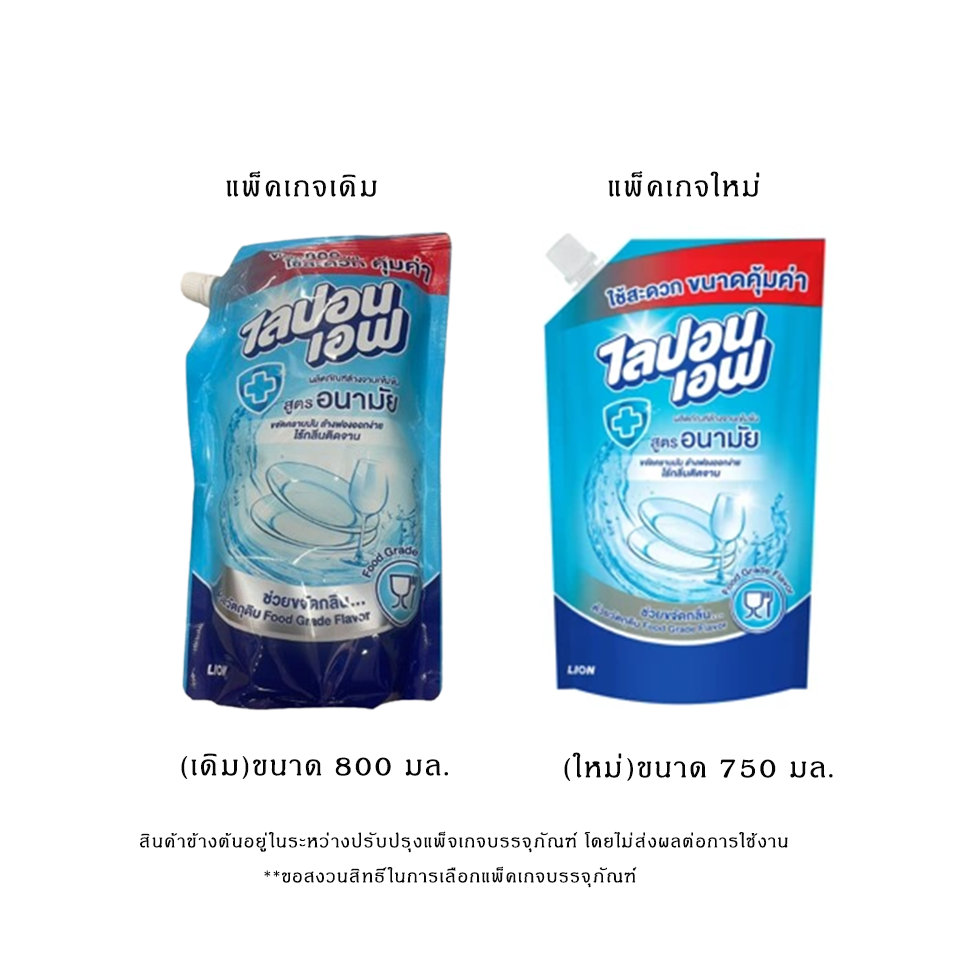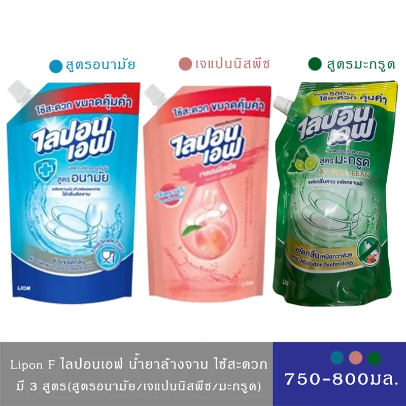 (มีให้เลือก 3 สูตร)Lipon F ไลปอนเอฟ น้ำยาล้างจาน สูตรเข้มข้นพิเศษ 750-800 มล. (1)น้ำยาล้างจาน ไลปอน เอฟ สูตรอนามัย ไลปอนเอฟ สูตรอนามัย ผ่านการทดสอบจนมั่นใจ ทุกหยดสะอาดใส่ มีค่าสารทำความสะอาดสูง ขจัดคราบมันไร้กลิ่นผลิตภัณฑ์ติดจาน ชนิดถุงเติมได้รับฉลากลดโลกร้อนมีส่วนช่วยลดการปล่อยก๊าซคาร์บอนไดออกไซด์ลงได้มากกว่าเดิม 5.6% (2)น้ำยาล้างจาน ไลปอน เอฟ สูตรมะกรูด ผลิตภัณฑ์ล้างจานเข้มข้นใช้สำหรับทำความสะอาด