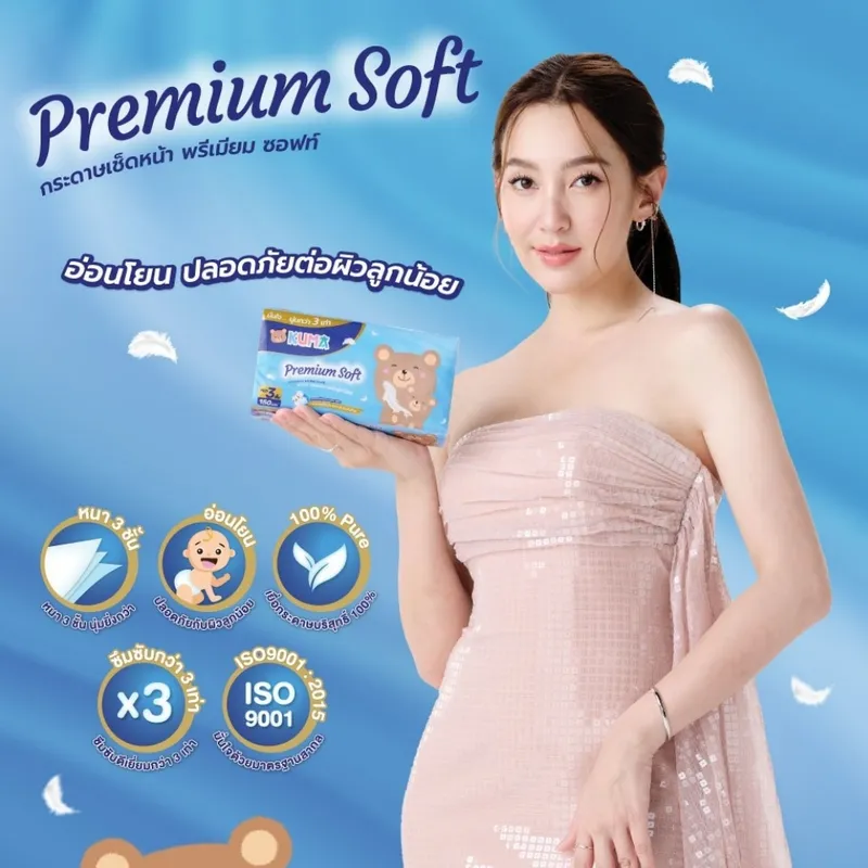 - พรีเมี่ยมซอฟต์เอ็กตร้า สัมผัสใหม่ที่นุ่มกว่า อ่อนโยนต่อผิวบอบบาง แพ้ง่าย