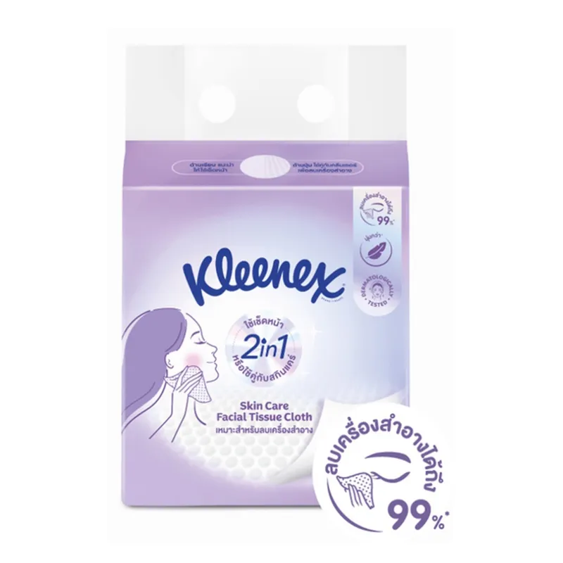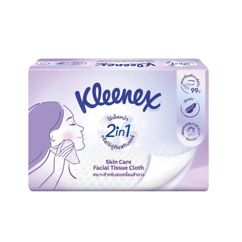 กระดาษเช็ดหน้าเนื้อผ้า KLEENEX (คลีเน็กซ์) Skin Care เนื้อสัมผัสกระดาษสองแบบ 2in1 ใช้เช็ดหน้าหรือใช้คู่กับสกินแคร์ทำความสะอาดผิวหน้า ลบเครื่องสำอางได้สะอาดถึง 99%เมื่อใช้คู่กับคลีนเซอร์ ให้สัมผัสนุ่มกว่า^ ขุยน้อย~ อ่อนโยนต่อผิวผ่านการทดสอบจากผู้เชี่ยวชาญด้านผิวพรรณ ผลิตจากเส้นใยธรรมชาติ100% ไม่มีส่วนผสมของสารเรืองแสง เพื่อให้การดูแลผิวของคุณสะดวกและประหยัดมากขึ้น