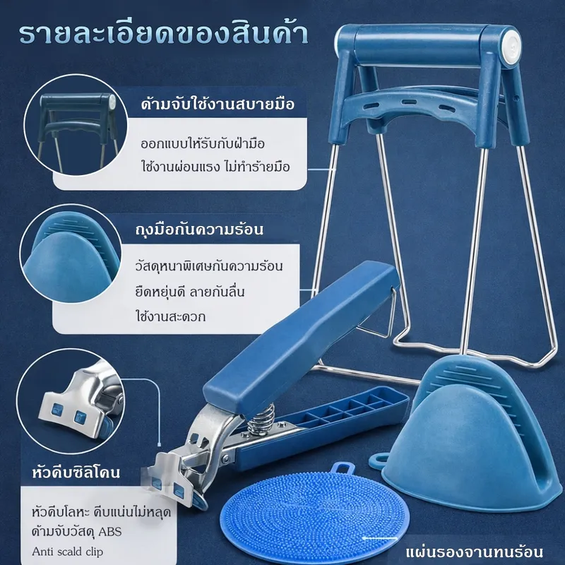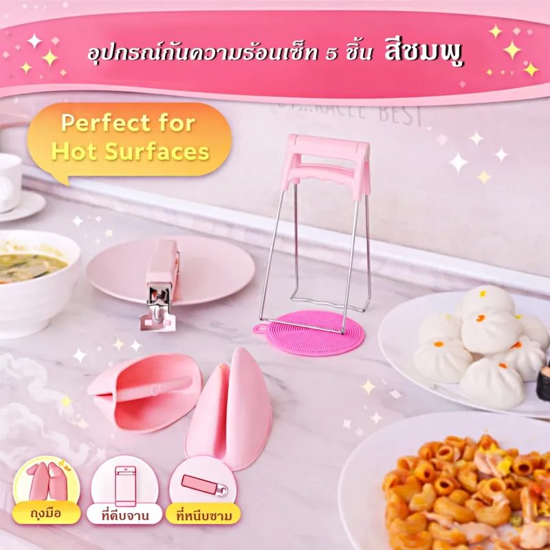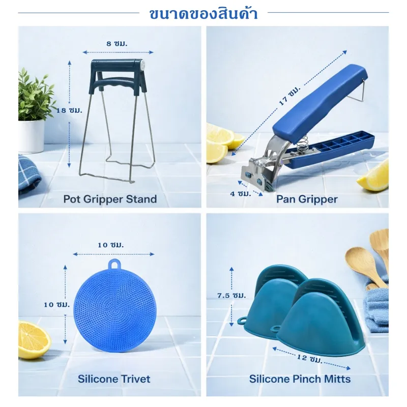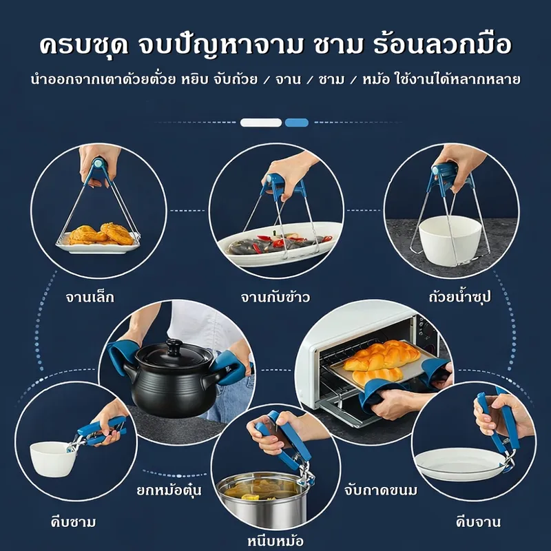 • ในชุดประกอบด้วย : ทีคีบจาน 1 / ที่หนีบชาม1 / ถุงมือกันร้อน2 / แผ่นรองกันร้อน1