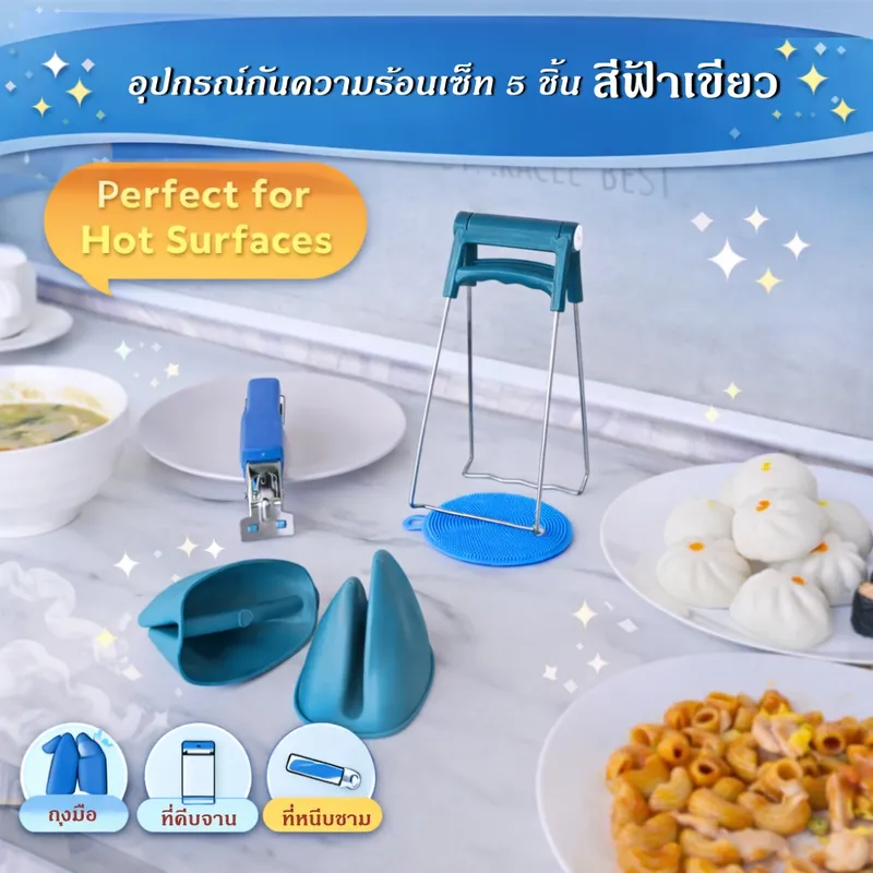 THE HOT CLIP ชุดอุปกรณ์กันลวกในครัว 5 ชิ้นผู้ช่วยมืออาชีพสำหรับงานครัว ช่วยให้การหยิบ ยก คีบ ภาชนะร้อนเป็นเรื่องง่าย ปลอดภัย ไม่ลวกมือ ออกแบบมาเพื่อใช้งานได้หลากหลาย ทั้งหม้อ ชาม จาน ถาด และอาหารจากเตาอบหรือไมโครเวฟหูจับฝาหม้อ ฝากระทะ