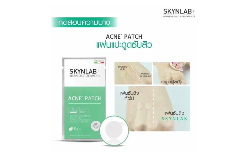 “Skynlab Acne Patch แผ่นแปะดูดซับสิว สกินแล็บ แอคเน่ แพทช์ 10ชิ้น แผ่นดูดสิว ปิดสิว สามารถลดการเกิดสิวและสิวอักเสบ โดยแผ่นซับสิวจะค่อยๆ ปล่อยสารที่ออกฤทธิ์อย่างช้าๆและต่อเนื่อง เพื่อเข้าลดเลือนรอยแดงและสิวที่เกิดจากแบคทีเรีย ดูดหนองภายใน 6-12 ชั่วโมง พิเศษมากๆคือ แผ่นเบาบางดีมาก สีเนียนสนิทกลมกลืนแนบไปกับผิว ทำให้สามารถแต่งหน้าทับได้อย่างไม่ต้องกังวล