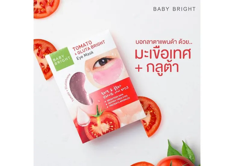 ” เบบี้ไบร์ท อายมาส์ก โทเมโทแอนด์กลูต้าไบร์ท BABY BRIGHT Tomato & Gluta Bright Eye Mask 2.5g x 1Pair แผ่นเจลมาส์กตาสดใส อุดมไปด้วยสารสกัดจากมะเขือเทศเข้มข้นที่มีไลโคปีนสูงซึ่งเป็นสารต้านอนุมูลอิสระสีแดงสด ช่วยฟื้นฟูผิวรอบดวงตาที่อ่อนล้าให้กลับมาเปล่งปลั่งสดใสอีกครั้งทั้งยังช่วยป้องกันความหมองคล้ำและริ้วรอยใต้ดวงตา ผสานสารกลูต้าจากธรรมชาติช่วยลดเลือนรอยหมองคล้ำให้ดวงตาดูกระจ่างใส แลดูอ่อนเว์ แผ่นเจลออกแบบเป็นรูปตัว Cที่ใช้มาส์กบริเวณใต้ตาได้อย่างพอเหมาะ เนื้อเจลเย็นสบายช่วยให้รู้สึกผ่อนคลายขณะมาส์ก