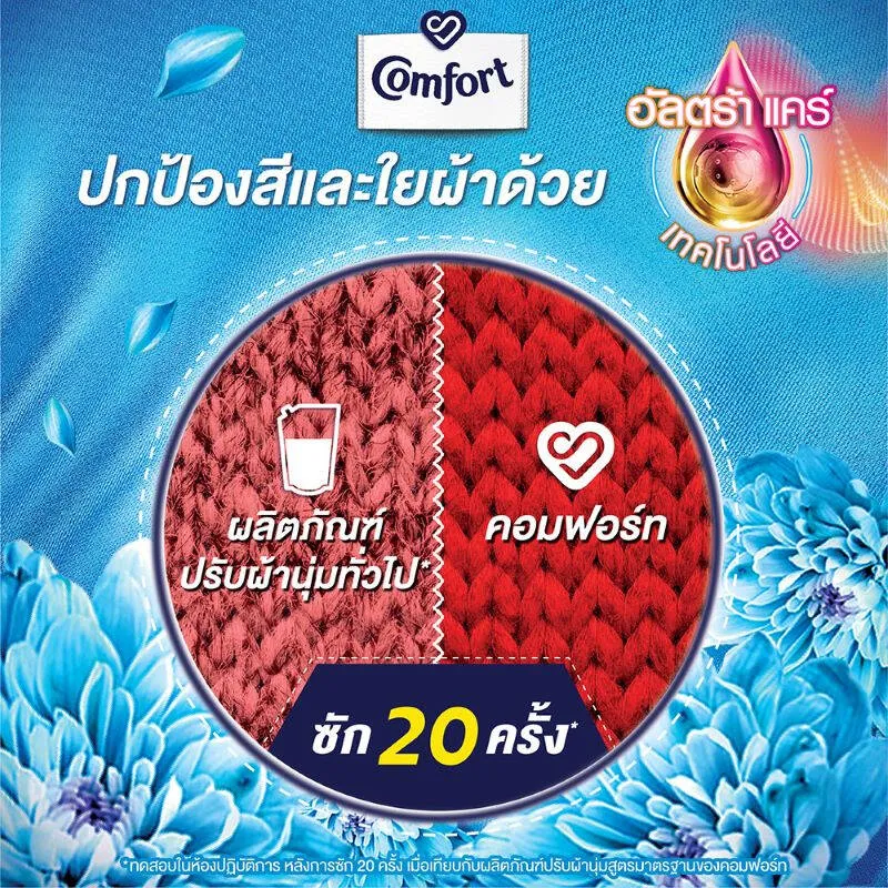 “(แพ็ค 2 ถุง)Comfort คอมฟอร์ท อัลตร้า น้ำเดียว แบบ ถุงเติม ฟ้า 540 มล. ช่วยเคลือบเพื่อเพิ่มความแข็งแรงให้เส้นใยผ้าช่วยปกป้องสีของเสื้อผ้าให้ดูสวยยาวนาน แม้ผ่านการซักมาหลายครั้งรุ่นอัลตร้า กลิ่นหอมสดชื่นปกป้องสีและใยผ้าไม่ให้ถูกทำลายจากการซัก (ผ้าเป็นขุยน้อยลง คงสีสันสดใส)สัมผัสประสบการณ์หอมสดชื่นด้วยเทคโนโลยีแคปซูลหอมสดชื่นแบบดับเบิ้ล บูสต์ให้ความหอมยาวนานแม้เก็บในตู้เสื้อผ้า และกระจายความหอมยาวนานตลอดทั้งวันพร้อมขจัดฟองออก ในน้ำล้างแรกสูตรเข้มข้นพิเศษ ขจัดฟองผงซักฟอกในน้ำเดียว ประหยัดเวลา แคปซูลหอมสดชื่นแบบดับเบิ้ลบูสต์ กระจายความหอมตลอดวันคุณสมบัติ 5 in 1 หอมติดผ้ายาวนาน ผ้านุ่มฟู รีดง่าย รักษาสีและใยผ้า ผ้าไม่ลีบติดตัวประหยัดกว่าสูตรมาตรฐาน 10 เท่า ใช้เพียง ½ ฝา
