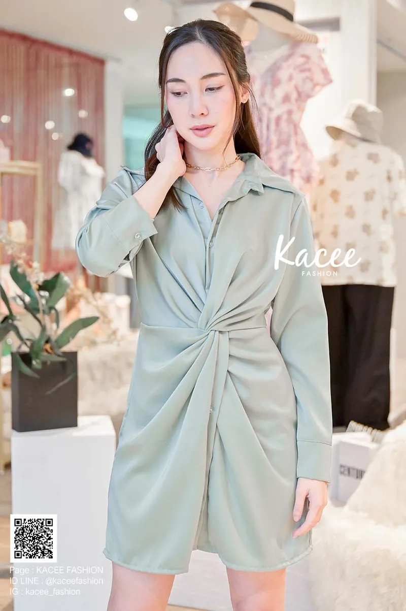 • ชุดเดรสเป็นคอปกแขนยาว หน้าชุดมีดีเทลแบบจีบกระดุมติด