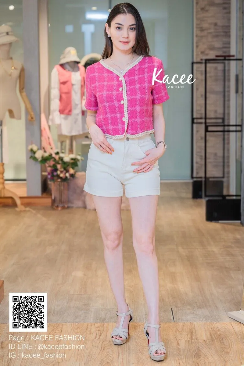 เสื้อทวิสแขนสั้น คอวี แต่งขอบถักเชือก กระดุมมุกขอบทอง ลายตารางสีของสินค้า: บานเย็น(FS)