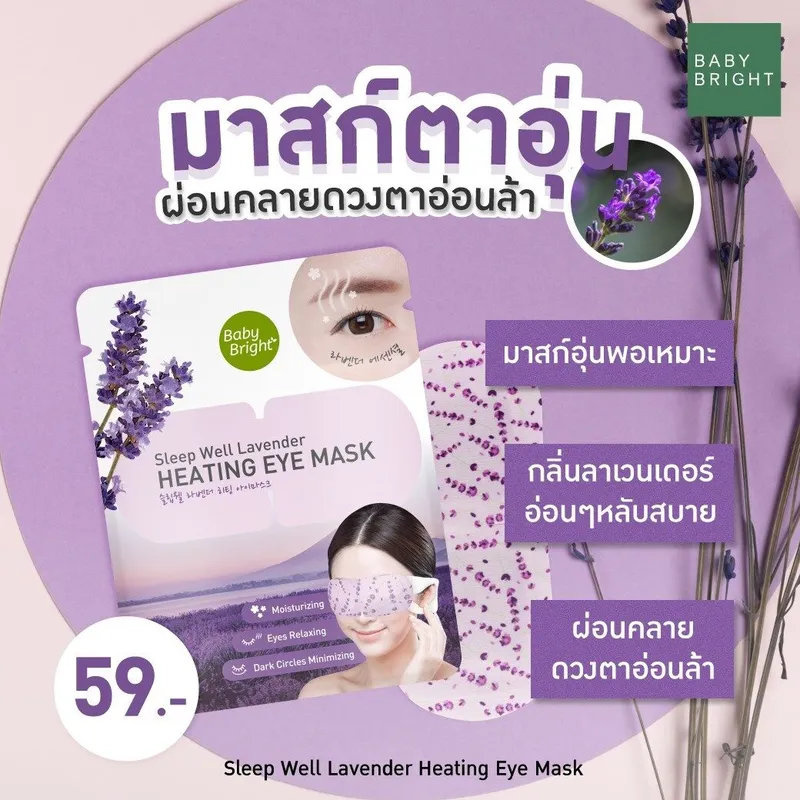 Baby Bright Sleep Well Lavender Heating Eye Mask มาส์กตาอุ่น บำรุงสายตาอ่อนล้าด้วยฮีตติ้งอายมาส์ก ดูแลผิวรอบดวงตา บอกลาถุงใต้ตาและสายตาอ่อนล้าด้วยฮีตติ้งอายมาส์ก ดูแลผิวรอบดวงตาอย่างอ่อนโยนเสมือนการทำสปาดวงตาง่ายๆ ที่บ้าน อุณหภูมิอุ่นพอเหมาะของแผ่นอายมาส์กไม่เป็นอันตรายต่อดวงตา ช่วยกระตุ้นการไหลเวียนโลหิตให้ดีขึ้น คลายอาการเมื่อยล้าดวงตา ลดอาการตาบวมให้ดวงตากลับมาสดใส สุขภาพดี พร้อมผ่อนคลายด้วยน้ำมันหอมระเหยจากธรรมชาติคือ กลิ่นสลีปเวลล์ลาเวนเดอร์ช่วยให้นอนหลับสบาย พักสายตาได้อย่างเต็มที่