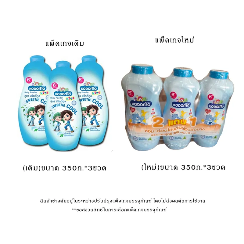 “KODOMO แป้งเด็ก โคโดโม สูตรสวีทตี้คูล Sweetie Cool 350 กรัม (สีน้ำเงิน) แพ็คคู่2+1 ขวด แป้งเด็กโคโดโม สูตรสวีทตี้คูล มีส่วนผสมของเมนทอล ให้ความเย็นสดชื่นอย่างอ่อนโยน และมีส่วนผสมของอโลเวรา (ว่านหางจระเข้) ช่วยให้ผิวนุ่มชุ่มชื่น และช่วยลดอาการคันบนผิวหนังพร้อมผ่านการทดสอบทาง การแพทย์ ว่าอ่อนโยน ไม่ระคายเคือง จากสถาบัน Skinnova Lab เนื้อแป้งผ่านการ Sterilization อีกขั้นของความปลอดภัย มั่นใจ -ให้เด็กคลายร้อน สบายตัว ทำกิจกรรมได้เต็มที่ทั้งวันและปลอดภัยสำหรับทุกคนในครอบครัว ด้วยแป้งที่เข้าใจพัฒนาการของเด็กอย่างลึกซึ้ง เลขจดแจ้ง 20-1-6300023977”