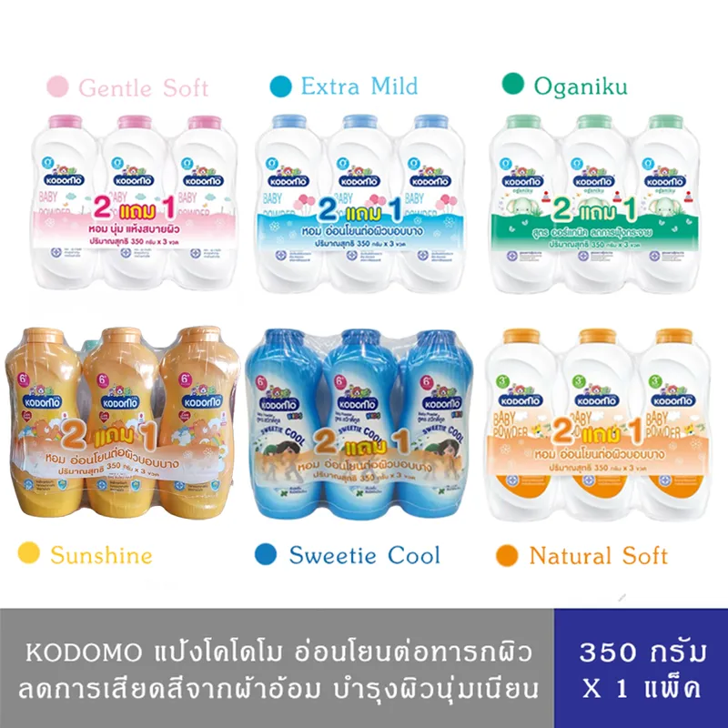 Kodomo แป้งเด็ก โคโดโม อ่อนโยนต่อทารกผิวบอบบาง สูตรเจนเทิลซอฟท์(ชมพู),เอ็กซ์ตร้ามายด์(ฟ้า),สวีทตี้คูล(น้ำเงิน),เนเชอรัล(ส้ม) 350ก.แพ็ค2+1 ขวด