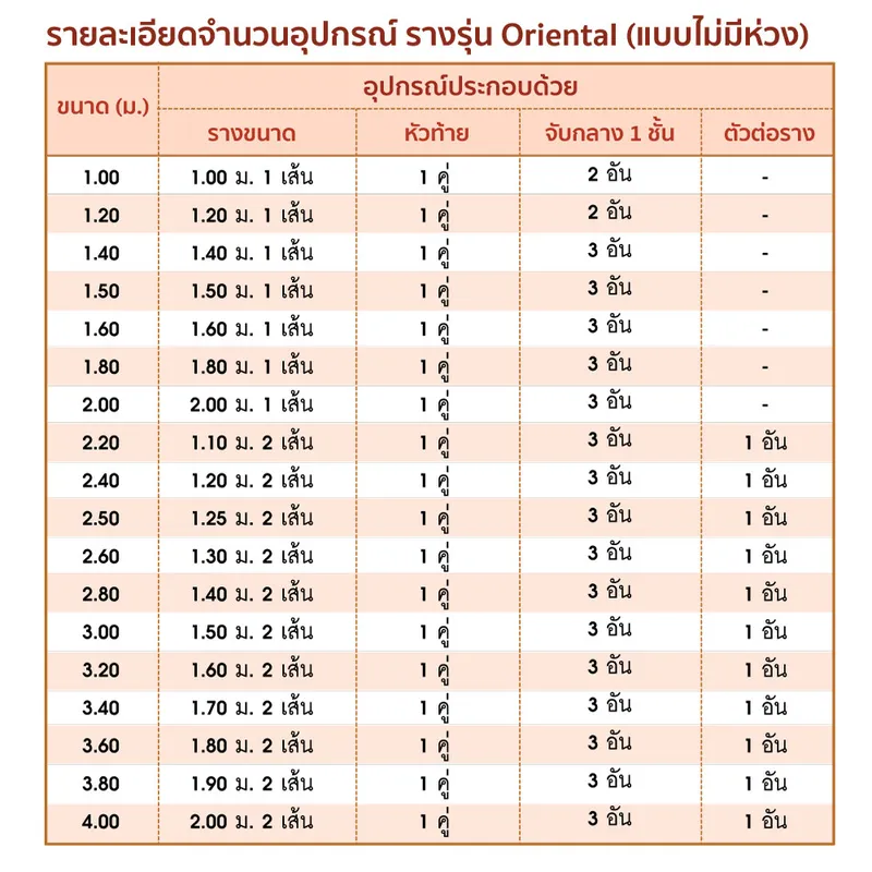 ตัวรางมีให้เลือกหลายขนาด เริ่มตั้งแต่ 0.90-4.00 ม. (ขนาดตั้งแต่ 2 เมตรขึ้นไปจะเป็นรางต่อ)