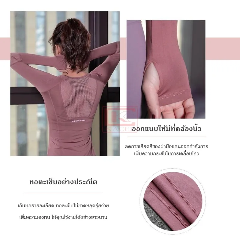 ระบายอากาศได้ดี ไม่อับชื้น ไม่ระคายเคืองผิว- สามารถใช้ได้ทั้งกิจกรรมในที่ร่มและกลางแจ้ง- เหมาะสำหรับสวมใส่ออกกำลังกายในทุกๆกิจกรรม อาทิเช่น โยคะ ฟิตเนส ว่ายน้ำ พิลาทิส ฯลฯ- ทอตาข่ายบริเวณด้านหลัง และ ข้อศอก - ลดการสะสมของแบคทีเรีย เนื่องจากเป็นบริเวณส่วนบนที่ร่างกายขับเหงื่อจำนวนมาก- บริเวณปลายแขนเสื้อ ออกแบบมาพร้อมที่เกี่ยวนิ้ว- ช่วยลดการเสียดสีระหว่างฝ่ามือกับพื้นผิว- เพิ่มประสิทธิภาพในการเคลื่อนไหว- สีสันสวยงาม ช่วยเพิ่มบุคลิกภาพให้สง่างามขนาดของสินค้า : รอบอก ความยาวเสื้อ ความยาวแขน ไซส์ S : 28-32 22 25 ไซส์ M : 32-34 23 25 ไซส์ L : 34-36 24 26 ไซส์ XL : 36-38 25 26หมายเหตุ :- สีของสินค้าขึ้นอยู่กับหน้าจอแสดงผลของแต่ละรุ่น- ใช้ผลิตภัณฑ์ซักผ้าที่ไม่มีสารเคมีรุนแรง- หลีกเลี่ยงผลิตภัณฑ์ซักผ้าขาว- ตากในที่ลมโกรก แสงแดดอ่อน- ไม่ควรตากในที่แดดจัดจนเกินไป- ไม่ควรซักแห้งและไม่ควรเข้าเครื่องอบผ้า- ขนาดรอบอกของสินค้าตัวเลขด้านหน้า คือ หน้าผ้าก่อนยืด และตัวเลขด้านหลัง คือ หลังยืด- ทั้งนี้แต่ละไซส์สามารถยืดได้อีก 2-3 นิ้ว โดยประมาน- ขนาดของสินค้าอาจมีความคลาดเคลื่อนจากอุปกรณ์ที่ใช้วัดขนาดKACEE BEST