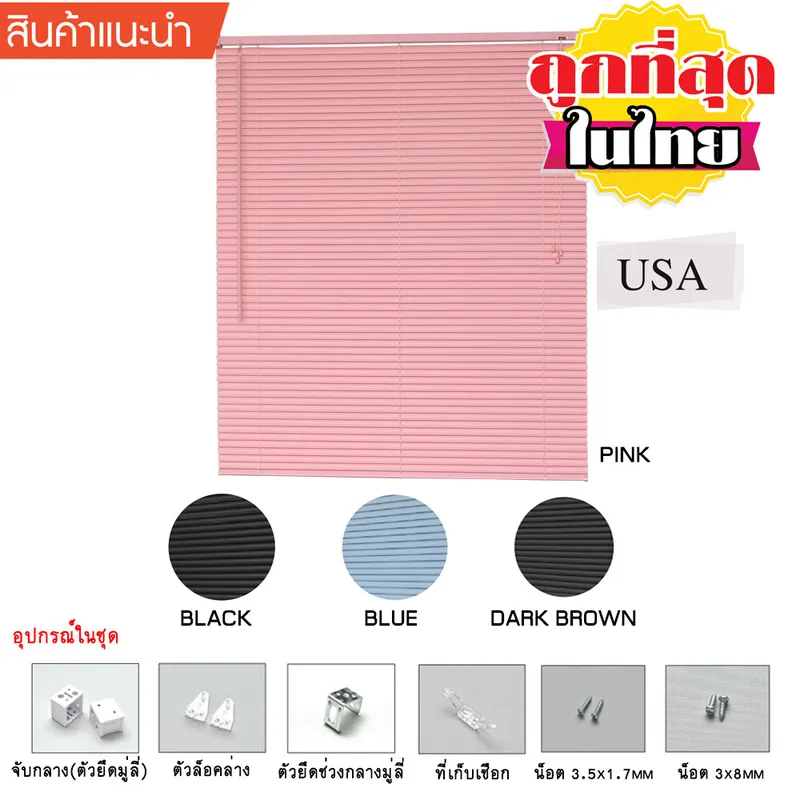 KACEE มู่ลี่ไวนิล ม่านหน้าต่าง มู่ลี่ PVC มู่ลี่ ขนาดใบ 25 มิล สีชมพู ฟ้า ดำ น้ำตาลเข้ม