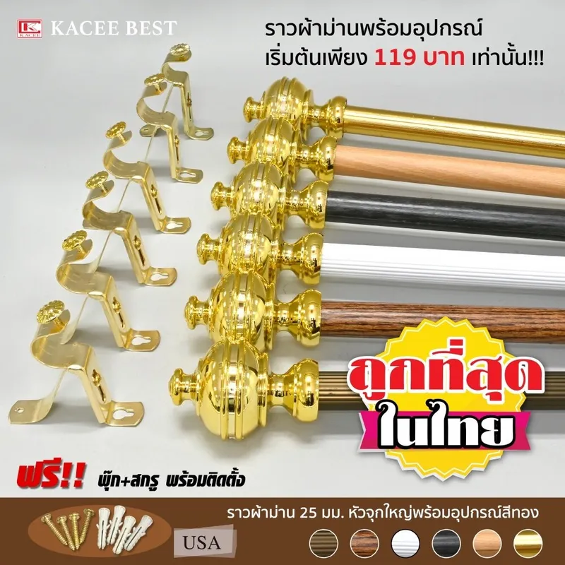 ขนาด 1.20 ม. (ความยาวไม่รวมส่วนหัวราง) : ราง 1.20 เมตร 1 เส้น, หัวท้าย 1 คู่, ขายึดราวม่าน 2 อัน