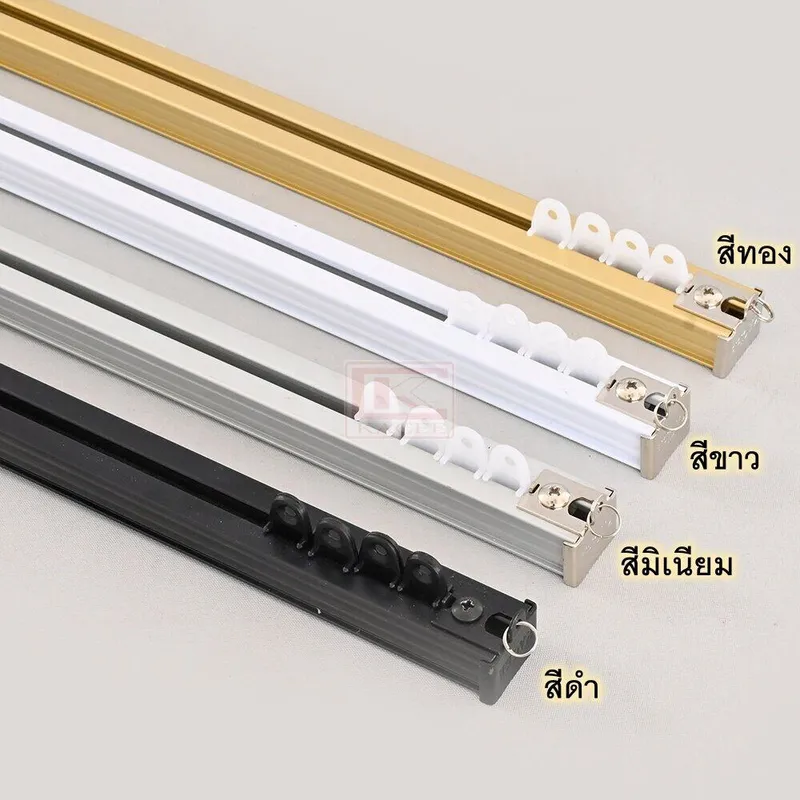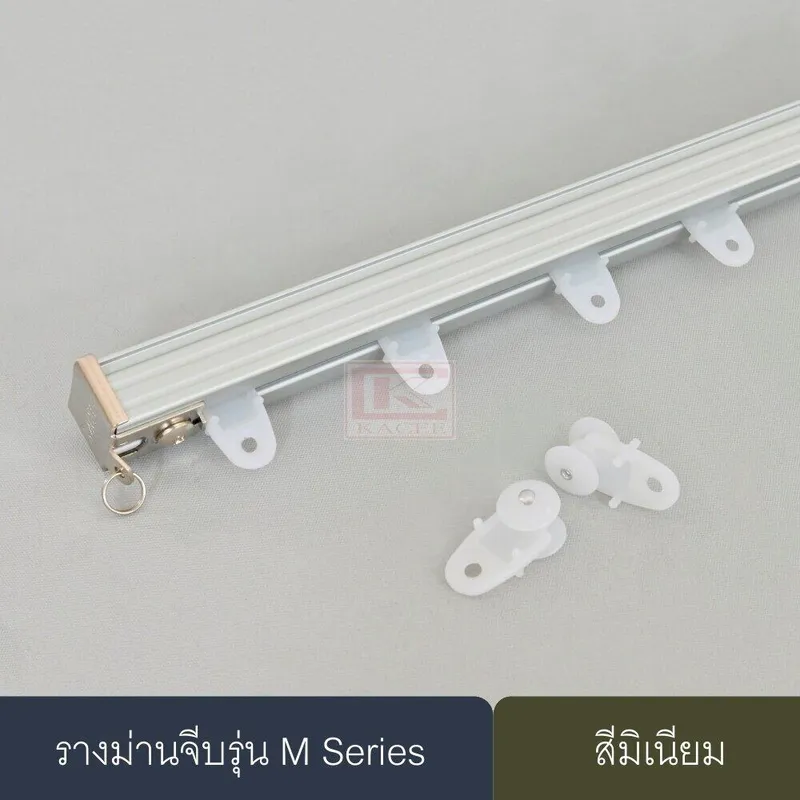 อุปกรณ์ประกอบด้วย : 1.20 เมตร 1 เส้น, ตัวปิดหัวท้าย 1 คู่, สไลด์ 1 คู่, ขายึดรางม่าน 2 อัน, ลูกล้อ 12 อัน