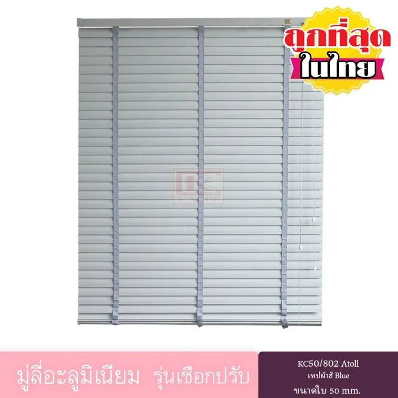 * ใน 1 ชุดจะประกอบด้วย : มู่ลี่อะลูมิเนียมขนาดใบกว้าง 50 มม. หนา 0.21 มม. รหัส KC50/802 สี Atoll เทปผ้าสี Blue