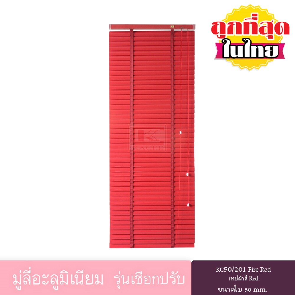 * ใน 1 ชุดจะประกอบด้วย : มู่ลี่อะลูมิเนียมขนาดใบกว้าง 50 มม. หนา 0.21 มม. รหัส KC50/201 สี Fire Red เทปผ้าสี Red