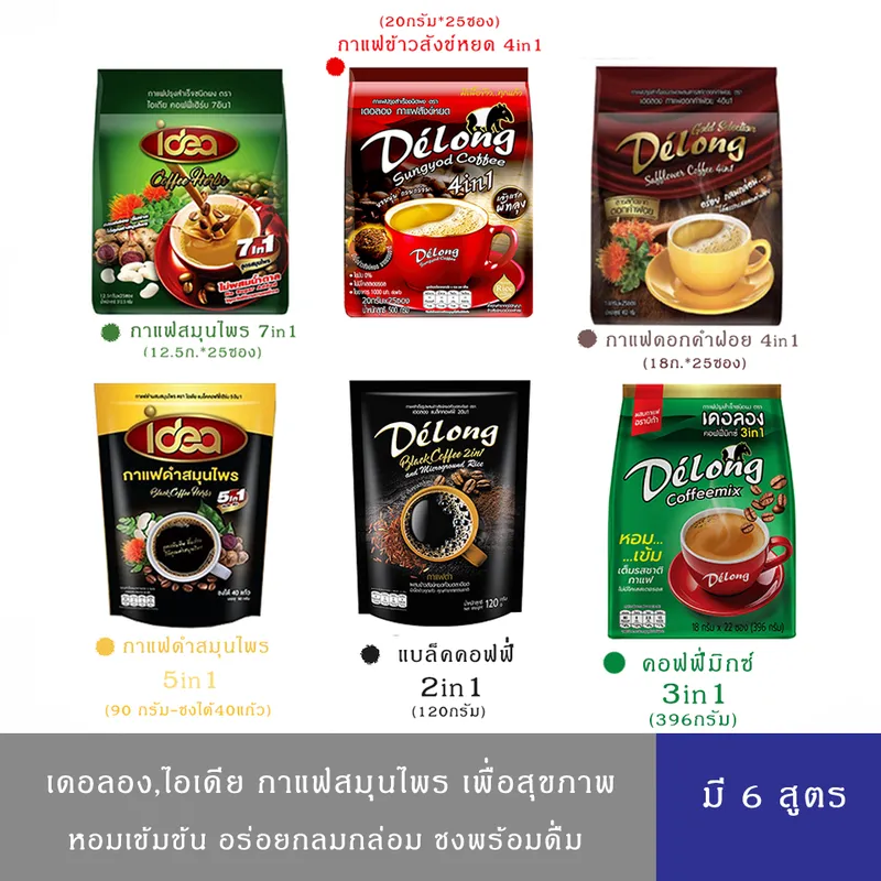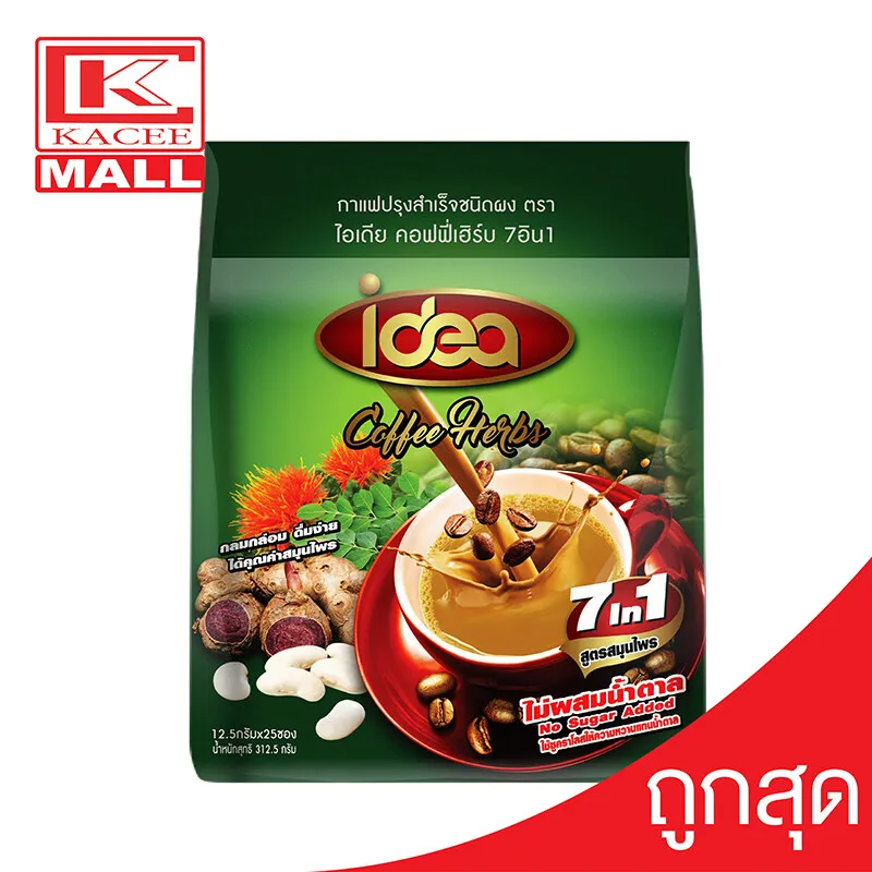 กาแฟไอเดีย มอบคุณค่าแห่งสมุนไพรไทย ด้วยวัตถุดิบที่เป็นสารสกัดคุณภาพดีได้ทั้งอร่อยและดูแลสุขภาพในเวลาเดียวกัน ปราศจากน้ำตาล โดยใช้ชูคราโลสเป็นวัตถุให้ความหวานแทนน้ำตาลมี ส่วนผสมของสมุนไพร 4 ชนิด✔สารสกัดจากดอกคำฝอยลดไขมันในเส้นเลือด ป้องกันไขมันอุดตันเส้นเลือด ป้องกันโรคความดันโลหิตสูงบำรุงประสาท ผ่อนคลายสมอง ยับยั้งเชื้อไวรัส และเชื้อแบคทีเรียบำรุงหัวใจ ช่วยให้เลือดไหลไปหล่อเลี้ยงที่หัวใจมากยิ่งขึ้น✔สารสกัดจากกระชายดำบำรุงธาตุในร่างกายได้ดีทำให้ร่างกายกระชุ่มกระชวยแก้อาการนอนไม่หลับ บำรุงหัวใจ ช่วยขยายหลอดเลือดหัวใจ บำรุงเลือดของสตรีบำรุงหัวใจ ปรับสมดุลย์ บำรุงธาตุในร่างกาย✔สารสกัดจากถั่วขาวช่วยดึงไขมันเก่าๆ มาเผาผลาญมากขึ้นมีใยอาหารสูงทำให้อิ่มนาน*ทำให้ระดับน้ำตาลอยู่ในภาวะปกติ✔ใช้น้ำตาลซูคราโลส แทนความหวานจากน้ำตาล✔สารสกัดจากใบมะรุมบำรุงตับ ลดความดัน ทำให้ระบบขับถ่ายสมดุล