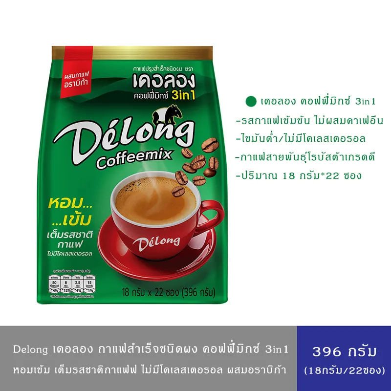 เดอลอง คอฟฟี่มิกซ์ 3 in 1 แพ็ค22 ซอง เลือกใช้วัตถุดิบมีคุณภาพจากโรงงานใหญ่ ใช้กาแฟสายพันธุ์โรบัสต้าเกรดดี ทำให้ได้รสชาติกาแฟเข้มข้น ไม่เปรี้ยว ไม่มีส่วนผสมของคาเฟอีนสังเคราะห์