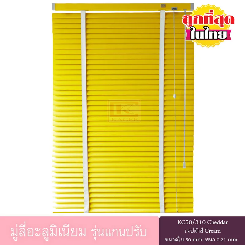 * ใน 1 ชุดจะประกอบด้วย : มู่ลี่อะลูมิเนียมขนาดใบกว้าง 50 มม. หนา 0.21 มม. รหัส KC50/310 สี Cheddar เทปผ้าสี Cream