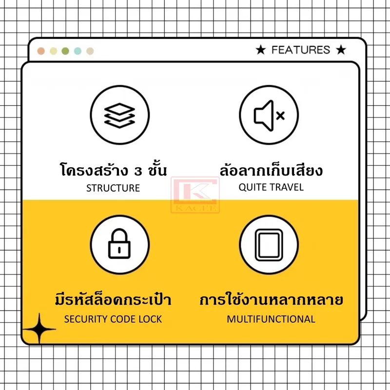 ● กระเป๋าเดินทางมีช่องใส่ของด้านหน้า อาทิเช่น เอกสารสำคัญ อุปกรณ์ไอที และอื่นๆ