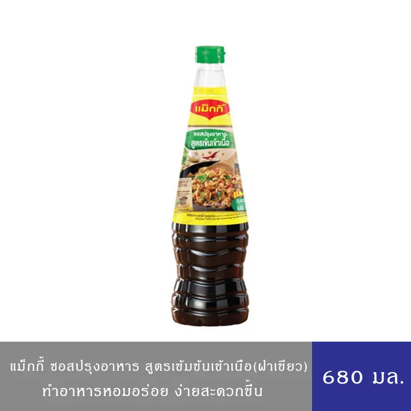 แม็กกี้ ซอสปรุงอาหาร สูตรเข้มข้นเข้าเนื้อ(ฝาเขียว) 680 มล. ซอสปรุงอาหาร สูตรเข้มเข้าเนื้อ ตราแม็กกี้ จากวิธีการหมักถั่วเหลืองด้วยวิธีธรรมชาติ ทำให้ได้รสชาติซอสที่เข้มข้นเข้าเนื้อ หอมอร่อยมากยิ่งขึ้น เหมาะสำหรับการหมัก ทอด ย่าง และเมนูอาหารไทยรสจัด เป็นต้น หนึ่งหน่วยบริโภค: 1 ช้อนโต๊ะ (15 มล.)