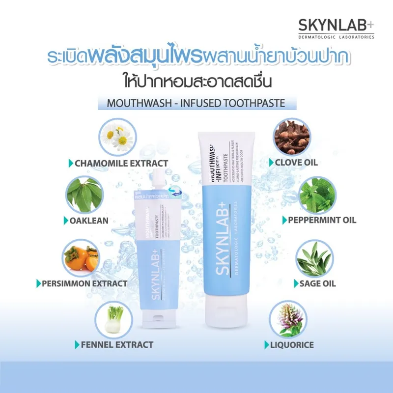 ใช้ทำความสะอาด ขจัดคราบและเศษอาหารในช่องปากร่วมกับยาสีฟันสกินแล็บ เพื่อให้ลมหายใจหอมสดชื่น