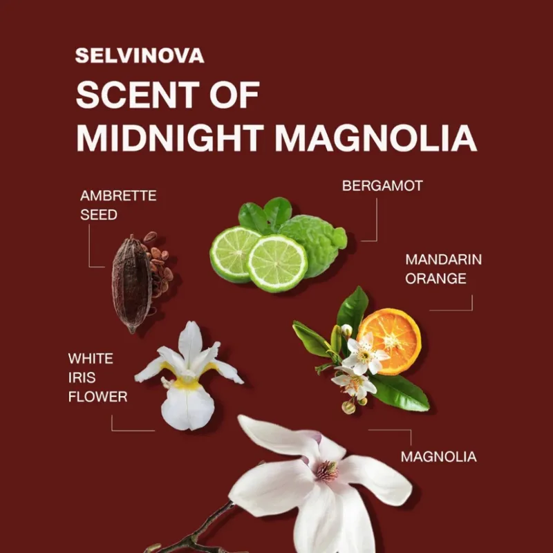 กลิ่น Midnight Magnolia กลิ่นเบลนพิเศษ Signature ของแบรนด์ SELVINOVA เป็นกลิ่นที่ลึกลับน่าค้นหา ขณะเดียวกันก็ให้ความสดชื่นผ่อนคลาย