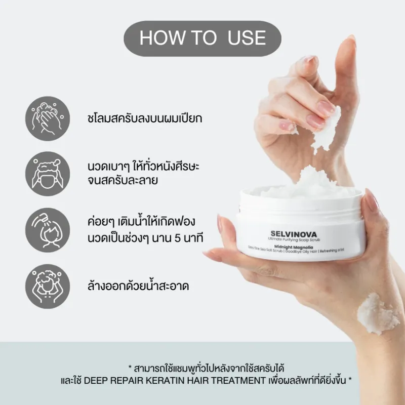 วิธีใช้ ชโลมสครับลงบนผมเปียกและนวดเบาๆ ให้ทั่วหนังศีรษะ ค่อยๆเติมน้ำให้เกิดฟอง นวดเป็นช่วงๆ