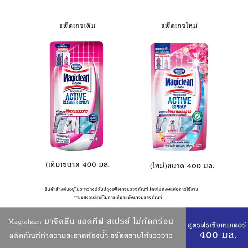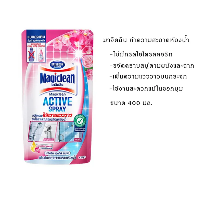 สำหรับใช้เติมมาจิคลีนสำหรับทำความสะอาดห้องน้ำ แบบสเปรย์ ขจัดคราบเข้าถึงซอกมุมและส่วนที่เข้าถึงยาก ทำความสะอาดได้บริเวณกว้าง สะดวกใช้ด้วยหัวฉีดระบบพิเศษ ปรับได้ถึง 3 แบบ สามารถขจัดคราบสบู่ คราบเหลือง คราบดำ สามารถใช้ได้กับพื้น ผนัง อ่างล้างหน้า โถสุขภัณฑ์ ฉากกั้นห้องน้ำ กลิ่นไม่ฉุน ไม่แสบจมูก