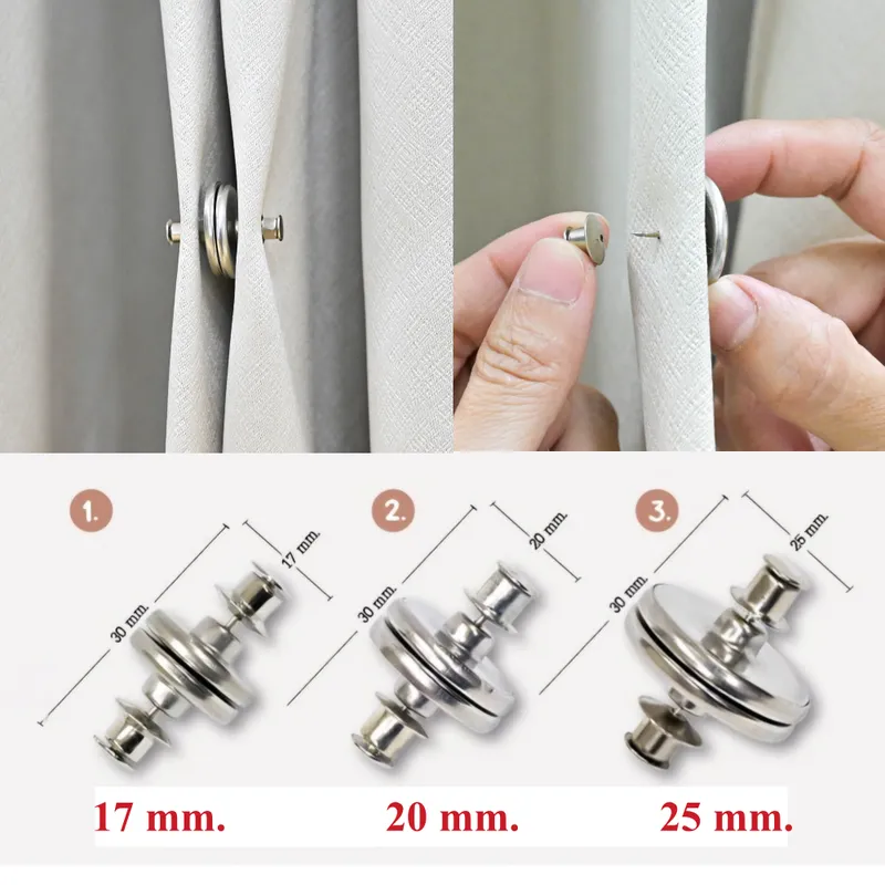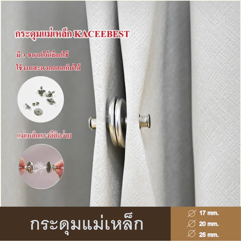 ●        กระดุมแม่เหล็กติดม่าน สีเงินมันวาว มี 3 ขนาดให้เลือกใช้คือ เส้นผ่านศูนย์กลาง 17 มม. ,20 มม. และ 25 มม.